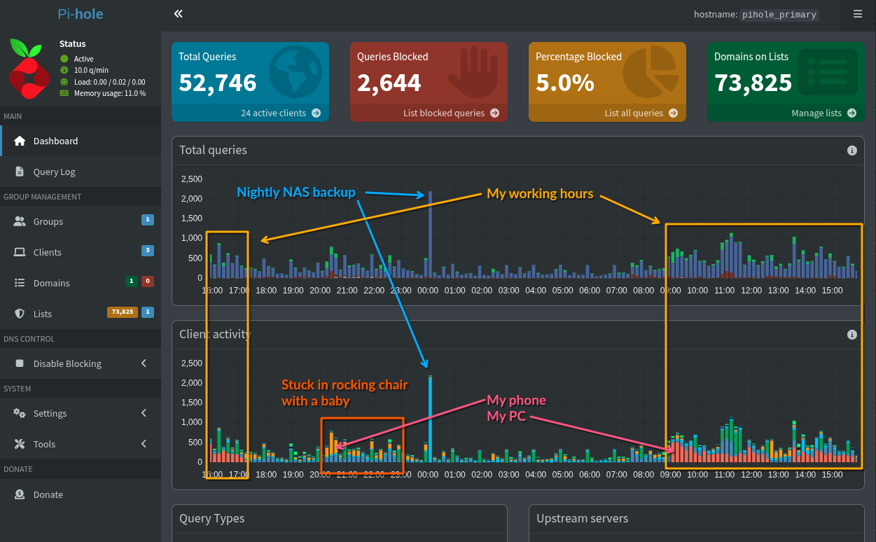Once installed, you'll start seeing every device on your network and every query they're making to whatever service. Depending on what blocking lists you're using, you'll also start seeing what is getting blocked and how often. Below is a screenshot of the last 24 hours of my network traffic.